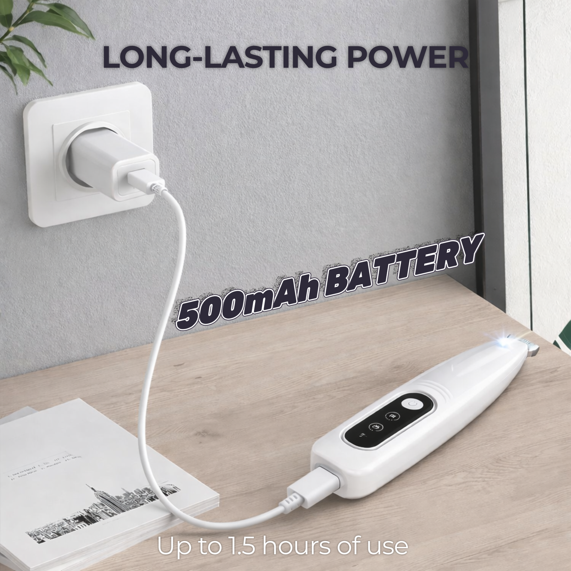 A full charge provides up to 1.5 hours of continuous use. Charging takes about 1.5–2 hours via USB-C, and you can even use it while charging, so you never have to stop mid-grooming.